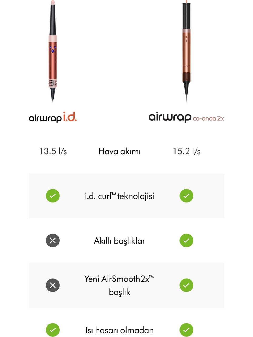 2 Dyson Airwrap i.d.™ saç şekillendirme ve kurutma setine kıyasla.