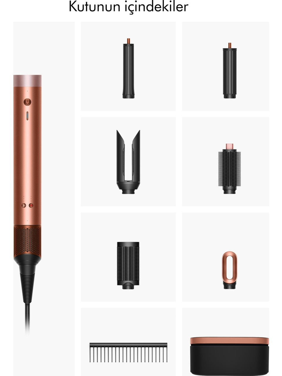 Dyson Airwrap CO-ANDA2X™ Saç Şekillendirme ve Kurutma Setimizin kutu içeriğinde; 30 mm Co-anda 2x bukle başlığı, 40 mm Co-anda 2x bukle başlığı, AirSmooth 2x başlık, Takılma önleyici fırça 2x, Yuvarlak hacimlendirici fırça 2x, Hızlı kurutma başlığı 2x ve Deri saklama kutusu bulunmaktadır.